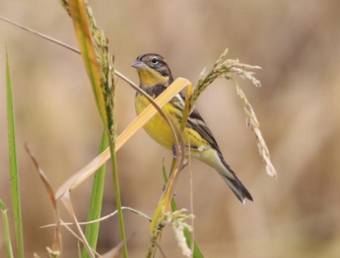 黄胸鹀为雀形目鹀科鹀属鸟类是小型鸣禽体长14至15厘米,体重19至29克。雄鸟胸腹部具有亮丽的金黄色羽毛,常栖息于大面积稻田、芦苇地或湿润的荆棘丛中,主要以昆虫和昆虫幼虫为食。