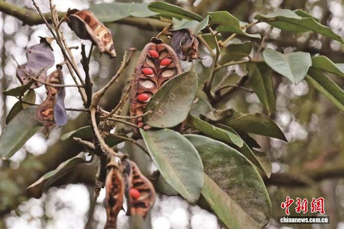 在五谷仙山,高大的花榈木植株格外引人注目,有的高达20米,胸径达30厘米,与周围郁郁葱葱的景象相互映衬,构成了一幅宁静而美好的画面。而挂在枝头的花榈木种子,一颗颗鲜艳的红豆宛如璀璨的宝石,在绿叶的簇拥下显得格外耀眼。